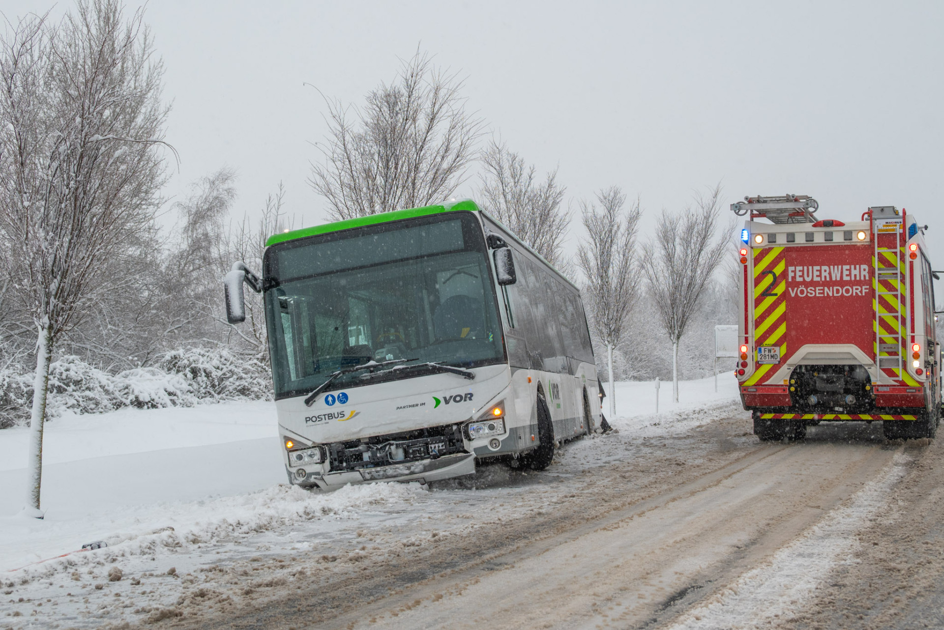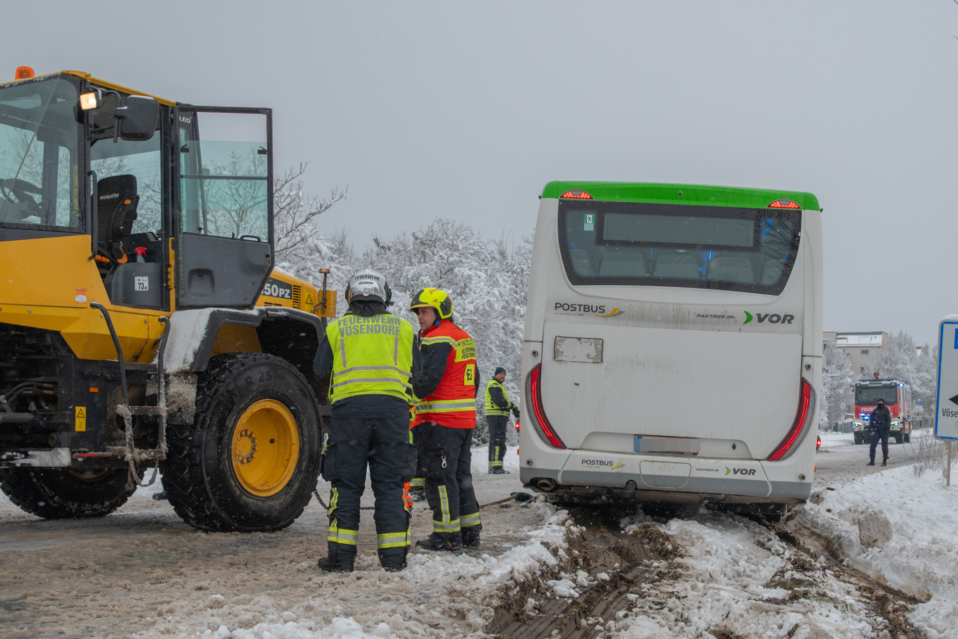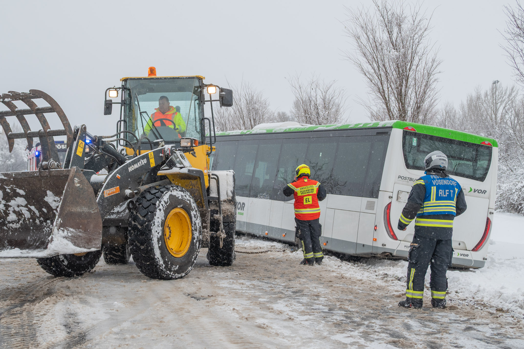 Parallel zu den Bergearbeiten wurde der Einsatzleiter über zwei weitere Einsätze in Kenntnis gesetzt. Aufgrund der Schneemassen war ein Baum umgestürzt sowie ein Bus von der Fahrbahn abgekommen.