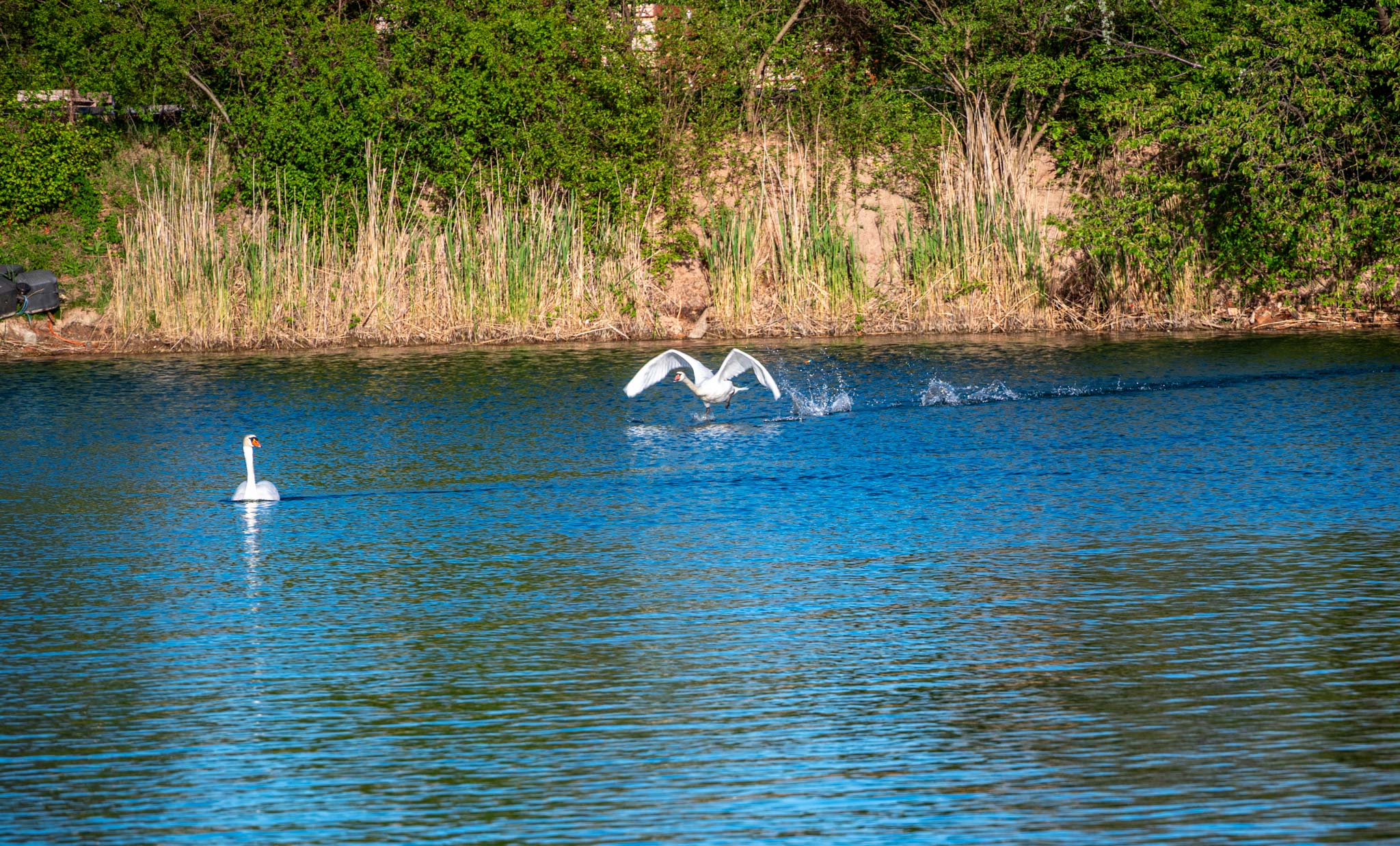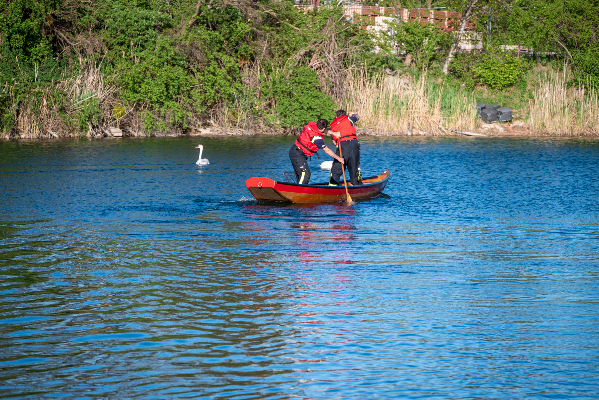 Bei einem Teich hatte sich ein Schwan in einer Angelschnur verfangen. Um das Tier von der Schnur zu befreien, wurde die Feuerwehrzille zu Wasser gelassen.